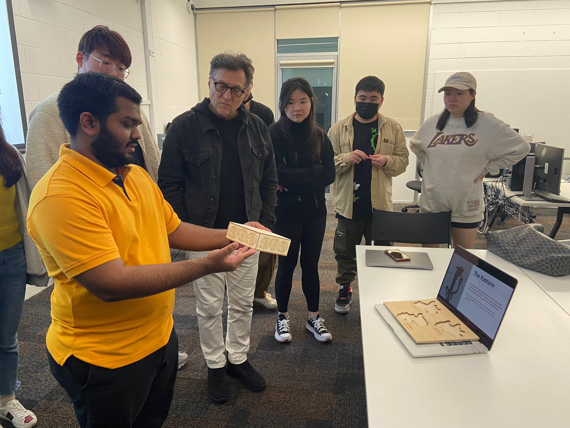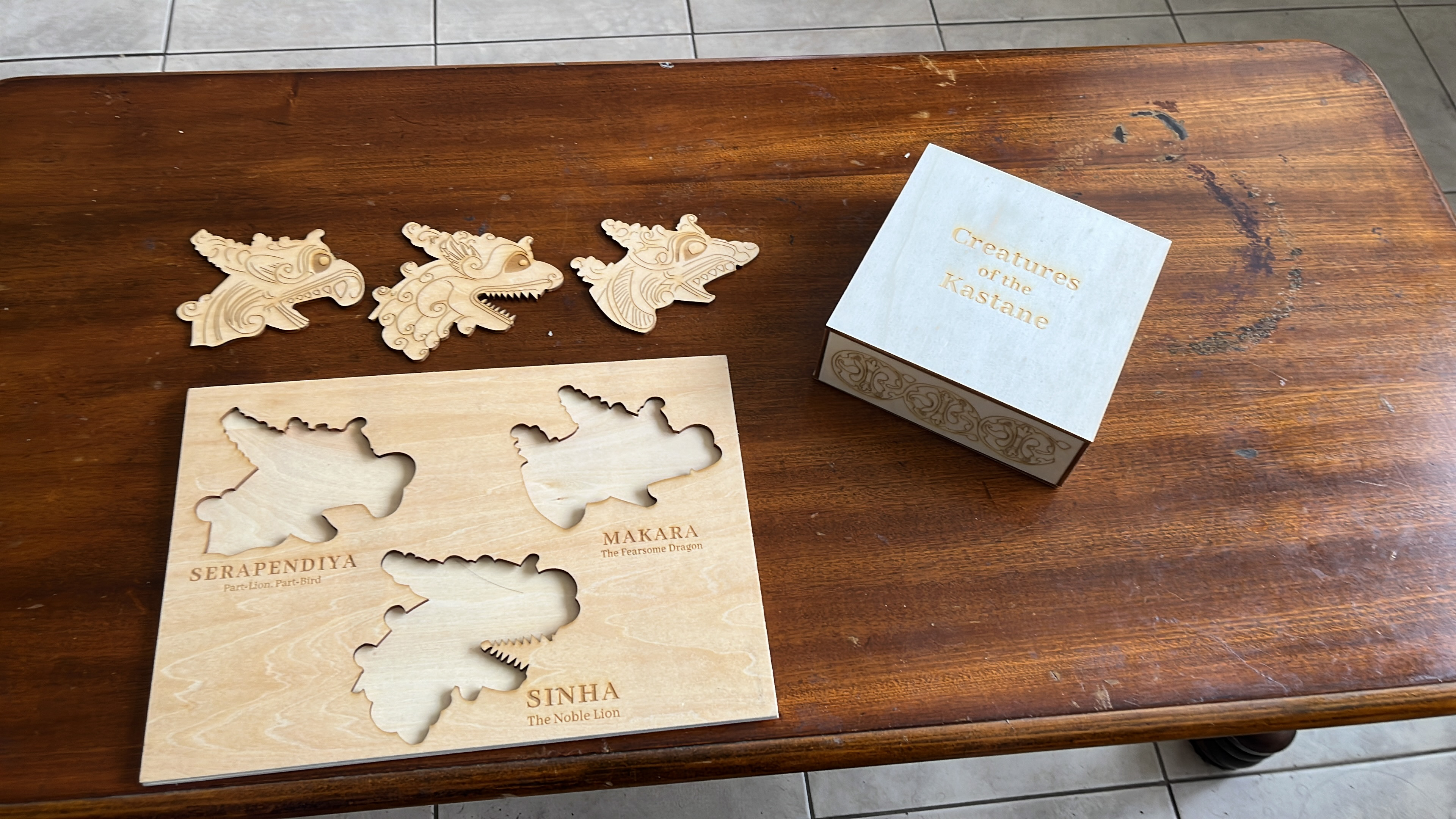 The Creatures of the Kastane Playset and Activity Board helps young (ages 5-12) BLV visitors to better engage with the kastane artefact by extracting the elaborate forms of the mythical creatures found on the sword hilt and scabbard into wooden figures that can be touched and looked at closely (this is the “playset” part of the concept).